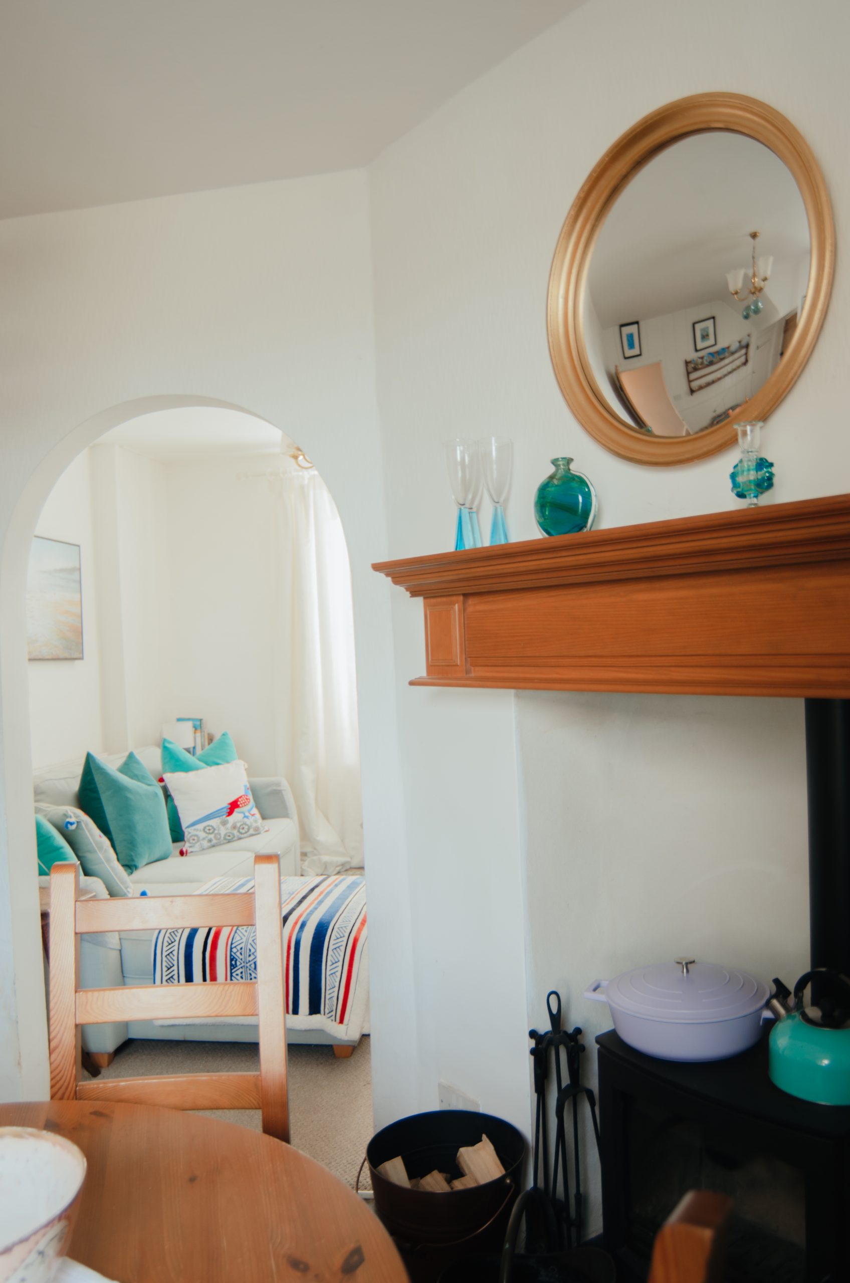 Dining area: has the original slate floor and a cosy wood burning stove along with sea views when you open the top of the stable door. Outside there is an awning to wind out while you sit and watch the tide go out.